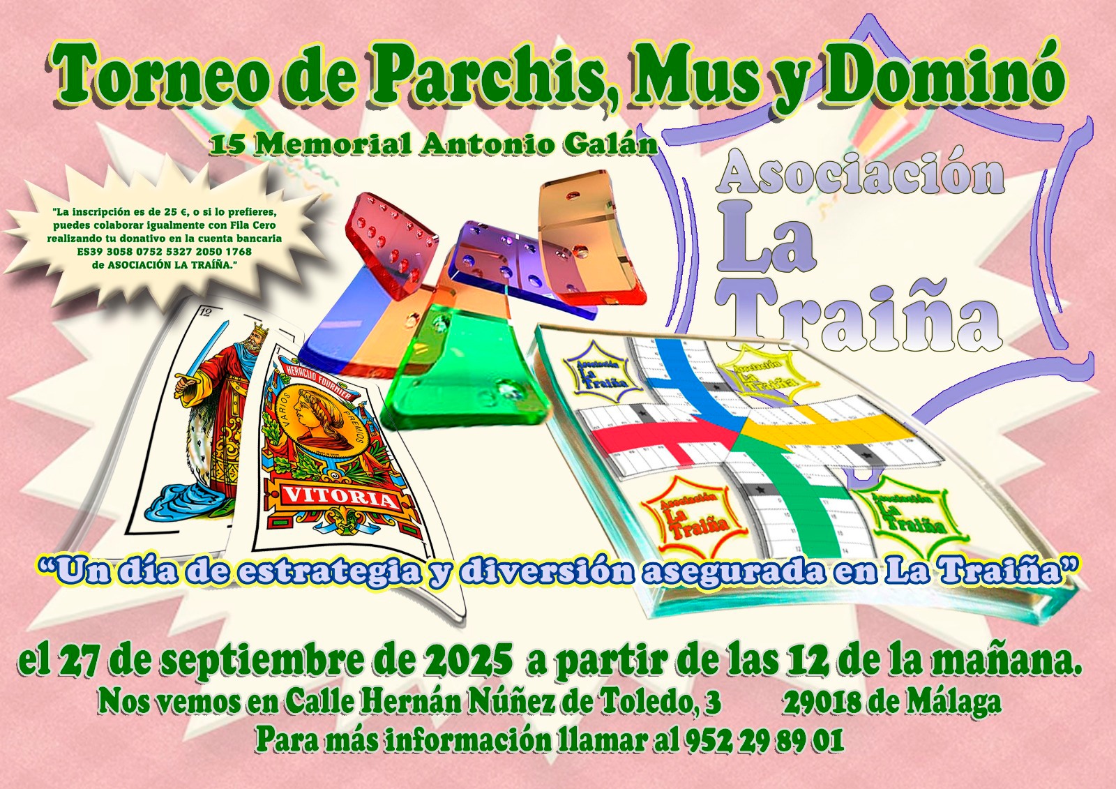 Vuelve el tradicional Torneo de Parchis, Dominó y Mus de La Traiña!!!!!! Os esperamos a todos el sábado 27 de septiembre a partir de las 12:00h. para disfrutar de una jornada entre amigos en las instalaciones de la Asociación (Avda. Hernán Nuñez de Toledo, 3). Recuerda que se puede participar en cualquiera de las tres modalidades o simplemente venir a pasar el día con nosotros. Tendremos servicio de bar con estupendas tapas y platas variados,... Ayudanos compartiendo el cartel!!!
